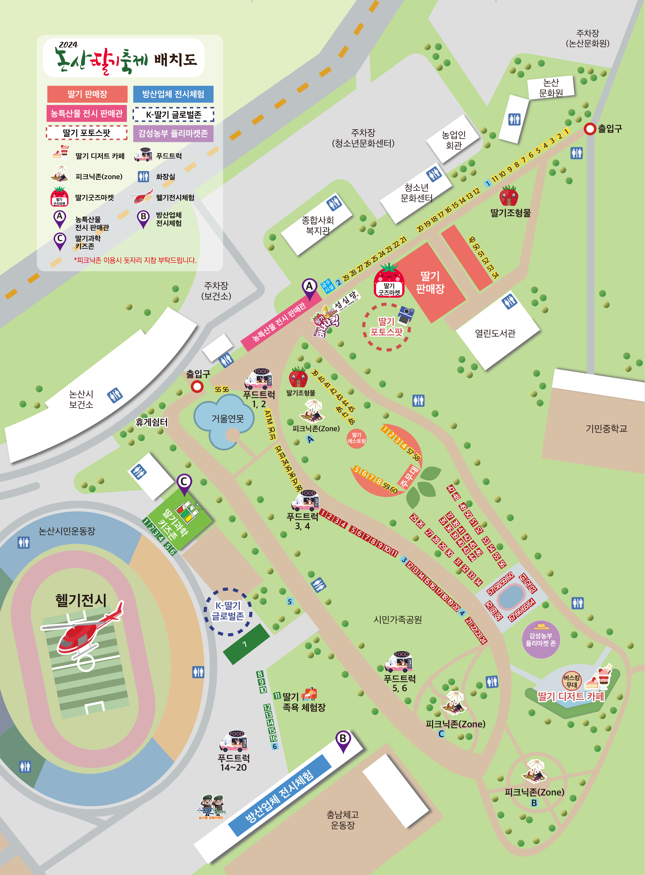 안내 배치도를 통해서 보게되면 딸기 판매장과 함께 농특산물 전시 판매관도 둘러볼 수 있으며, 피크닉존도 이용할 수 있어서 돗자리를 지참하여 아이들과도 편하게 축제를 즐길 수 있을 거 같습니다.