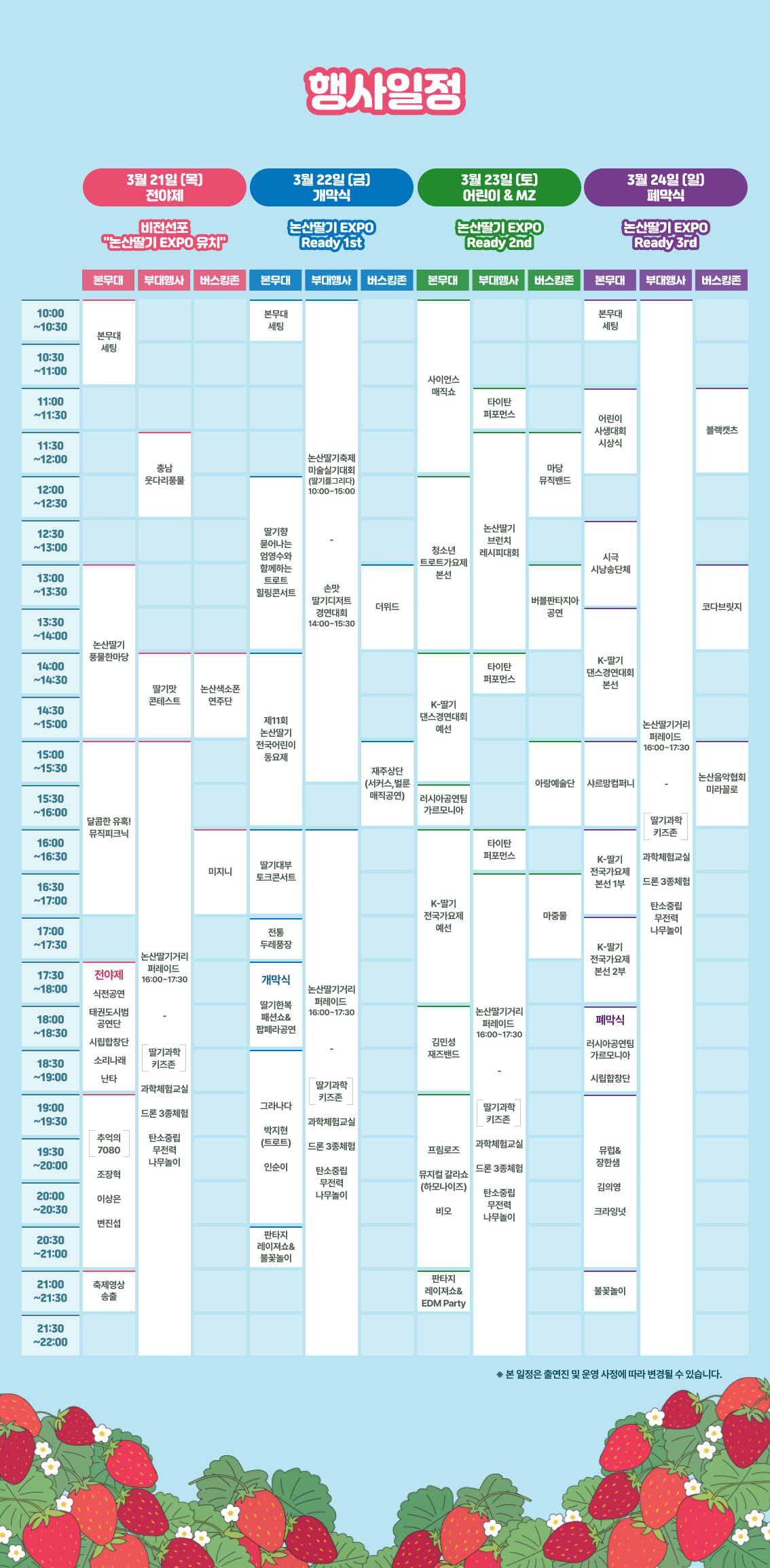 - 행사 일정표를 통해서 논산딸기축제 오는 일정을 참고하기에 좋습니다.