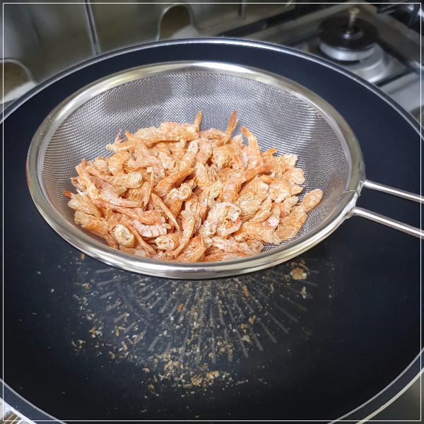 2. 준비한 건새우는 마른 팬위에서 바삭하게 수분을 날려서 나오는 가루를 채반에서 탈탈 털어준다.