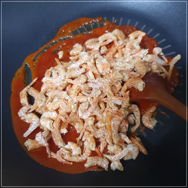 3. 중불로 예열한 팬 위에 만들어 놓은 양념장을 넣고 양념장이 많이 묽어진다 싶을 때 볶아놓은 건새우를 넣는다.