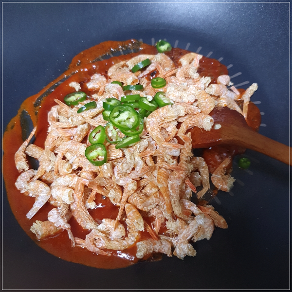 3. 중불로 예열한 팬 위에 만들어 놓은 양념장을 넣고 양념장이 많이 묽어진다 싶을 때 볶아놓은 건새우를 넣는다.