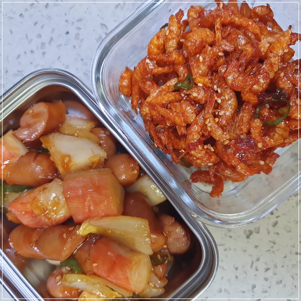 소시지 맛살볶음에는 고추장이 안들어가서 건새우볶음보다 양념이 더 가볍게 느껴진다.