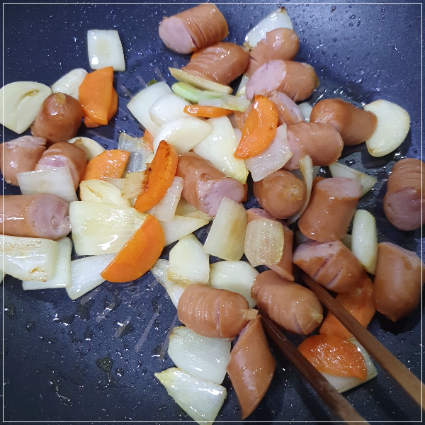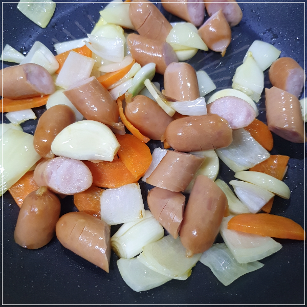 1. 가열한 팬에 식용유를 넣고 손질해 놓은 야채를 몽땅 넣어서 적당히 볶아준 뒤, 잘라놓은 소시지를 넣어준다. (당근을 얇게 썰어서 한 번에 넣어줬다.)