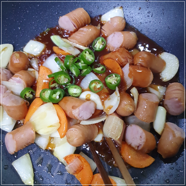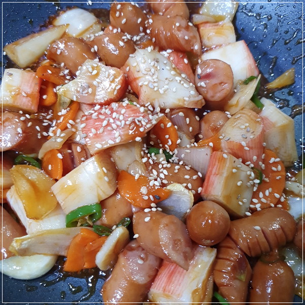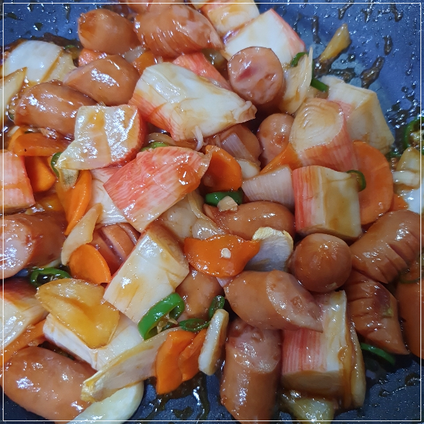간단하게 휘리릭~ 볶으면 되는 감칠맛 나는 "소시지 맛살볶음" 만들어보자.
