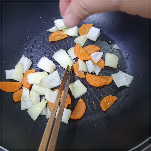 1. 가열한 팬에 식용유를 넣고 손질해 놓은 야채를 몽땅 넣어서 적당히 볶아준 뒤, 잘라놓은 소시지를 넣어준다. (당근을 얇게 썰어서 한 번에 넣어줬다.)