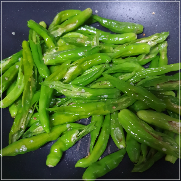 3. 달궈둔 팬 위에 식용유 2T를 넣고, 반으로 잘라놓은 꽈리고추와 소금을 조금 넣고 볶아준다. (볶을 때 고추씨가 간혹 튈 수가 있으니 조심해야 한다.)