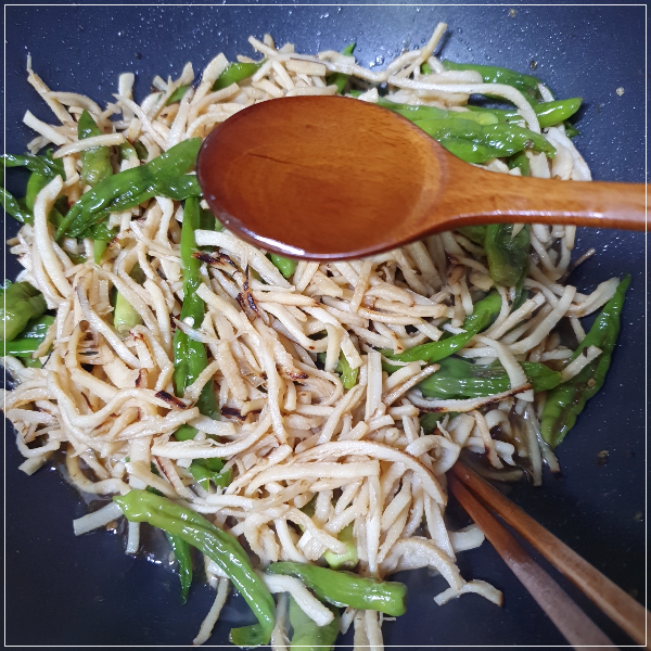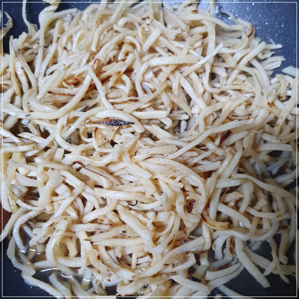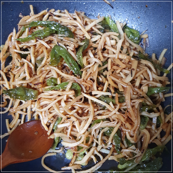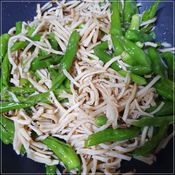 5. 사용한 팬에 꽈리고추를 건져내고 식용유를 추가해서 적당한 크기로 자른 진미채를 넣어서 볶아준다.