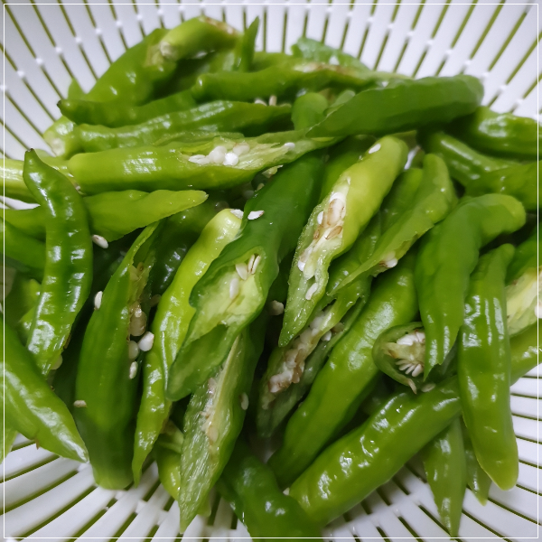 1. 꽈리고추를 비스듬하게 반으로 잘라주고 고추씨를 적당히 털어준다.