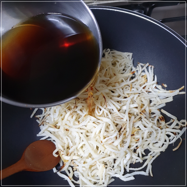 6. 살짝 늦게 뒤집었더니 좀 탔지만 진미채를 조금 볶아준 뒤에 준비해 놓은 간장물(간장, 물, 미림)을 부어준다.