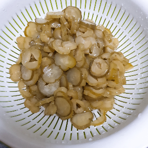 4. 다 썰어서 물에 한번 헹구어둔 오이지를 채반에 넣고 물엿을 한 2번 둘러서 여유 있게 30분 이상 방치해 둔다. (TIP : 엄마의 말씀으로는 물엿을 둘러주게 되면 물기도 더 자연스레 빠지고 오이지가 꼬들꼬들해진다고 하셨습니다.)