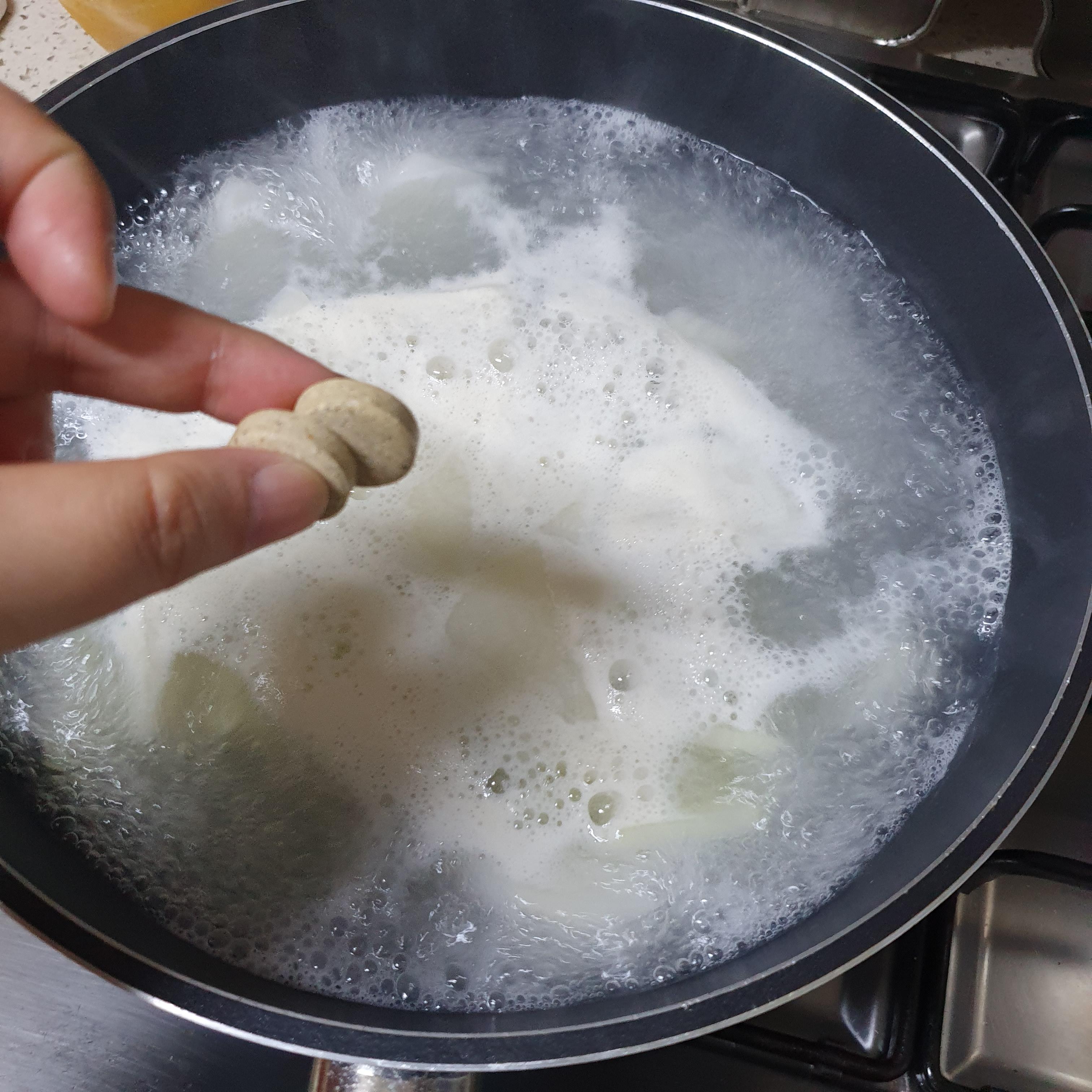 16. (선택사항) 쌀뜬물, 육수 만들 때 육수 코인 2알, 다시다 or 미원