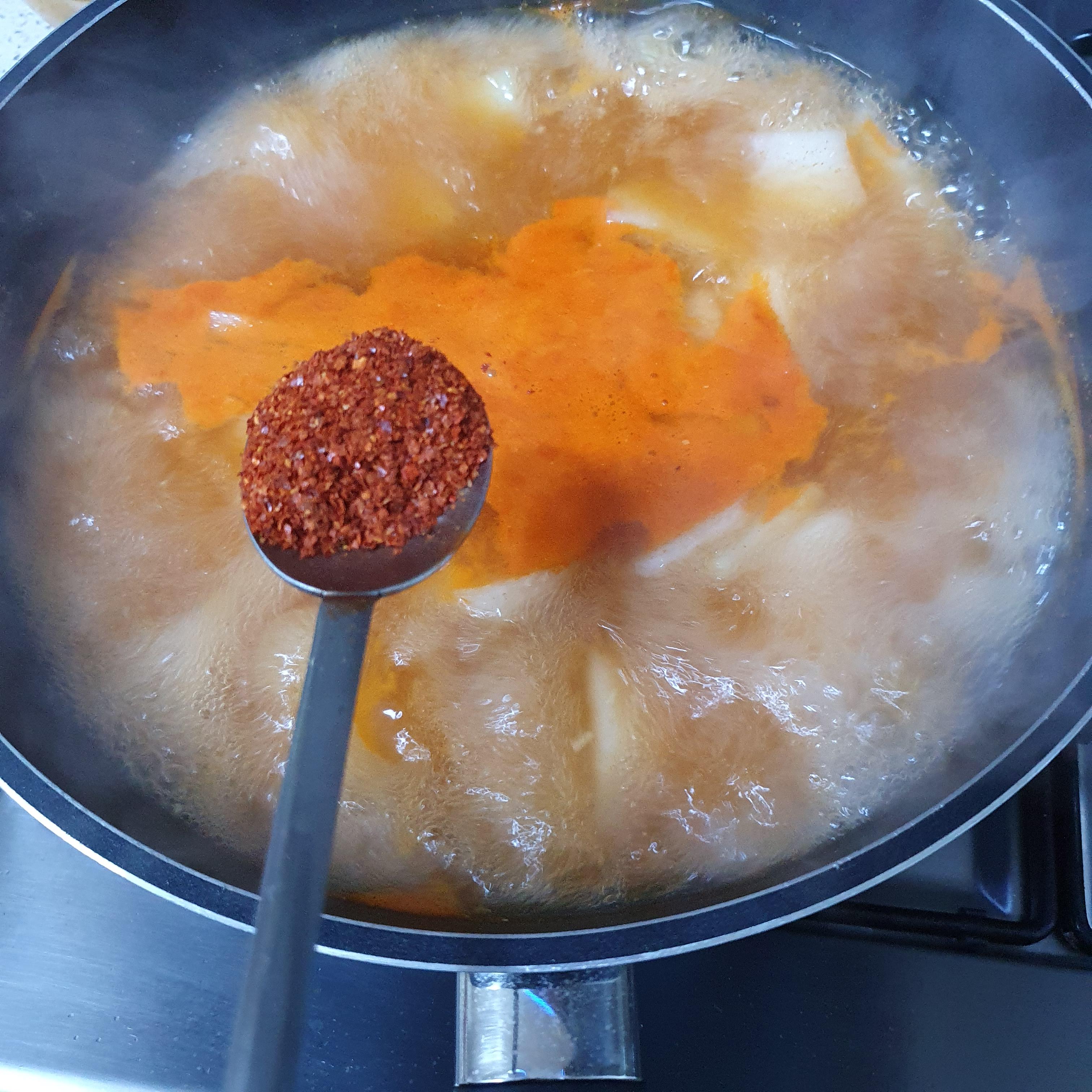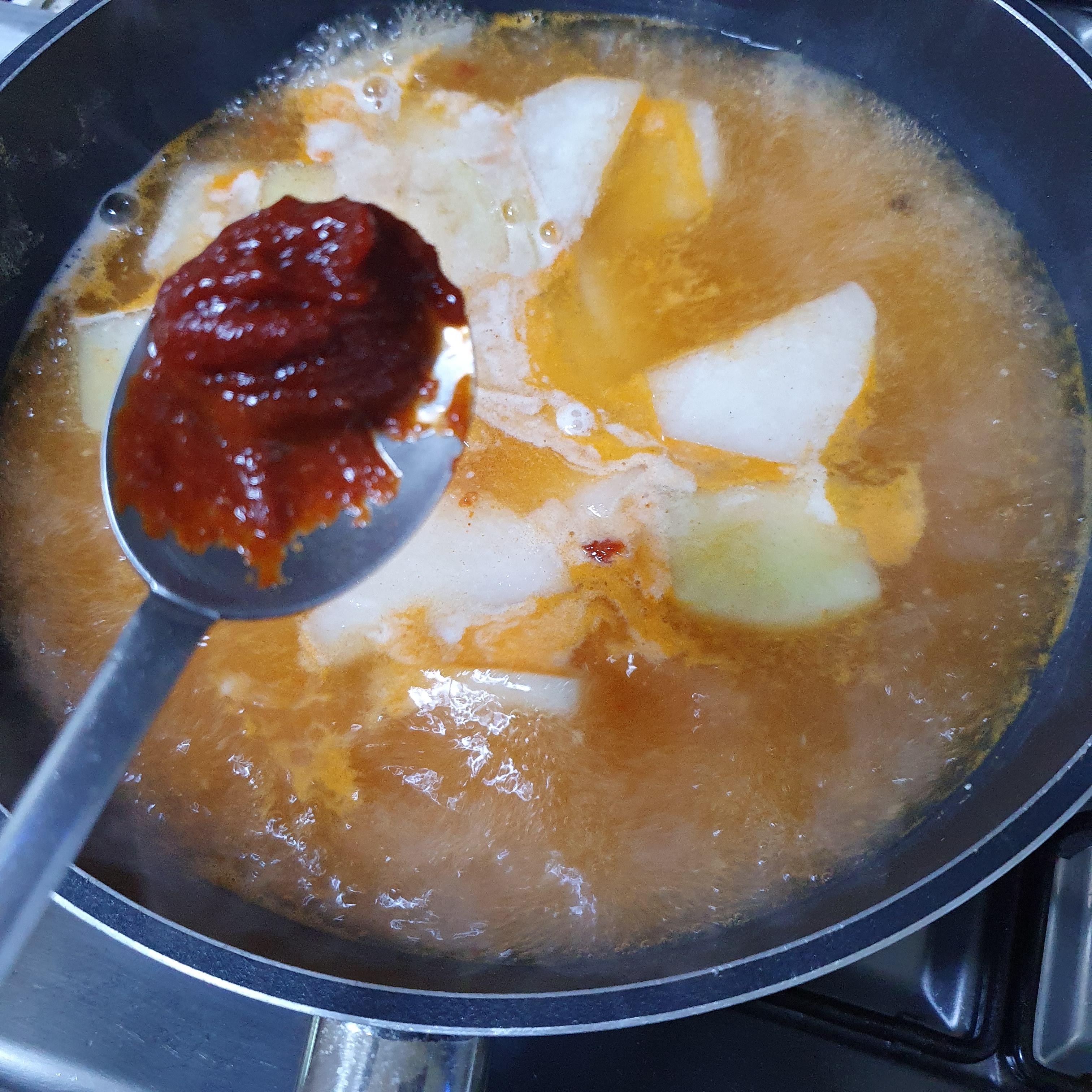 5. 시중에서 파는 된장 반스푼, 고추장 반스푼 넣어서 계속 끓인다. (고추장은 텁텁해서 많이 안 넣으신다고 한다.)