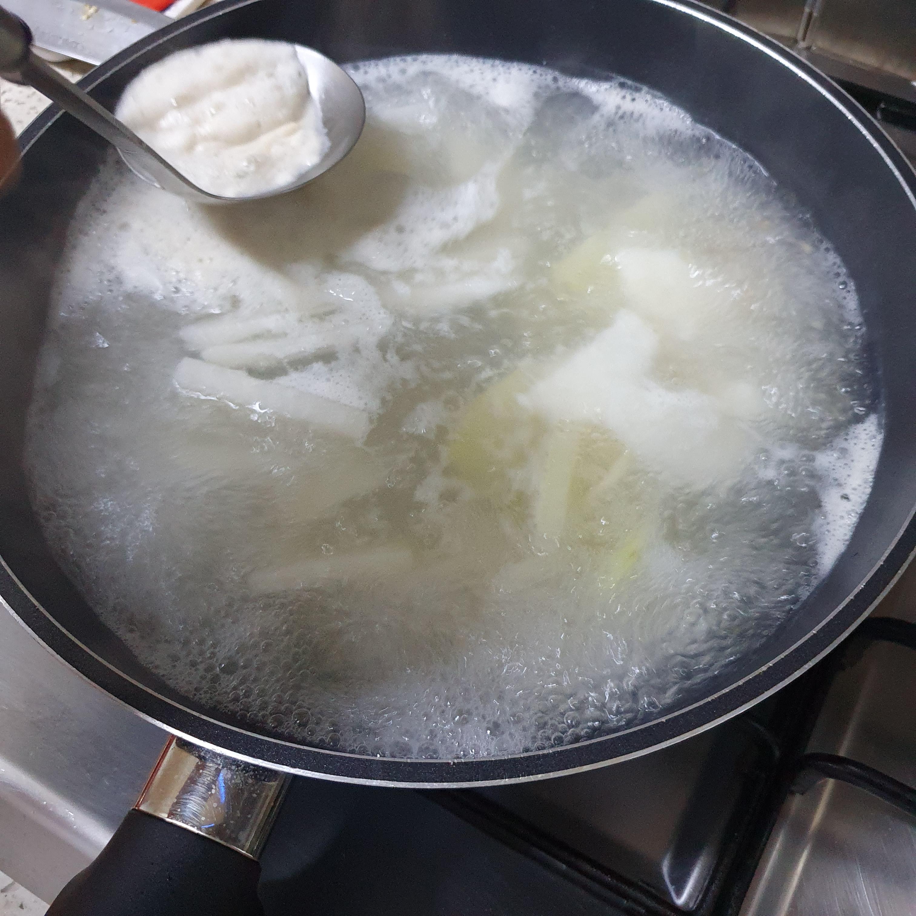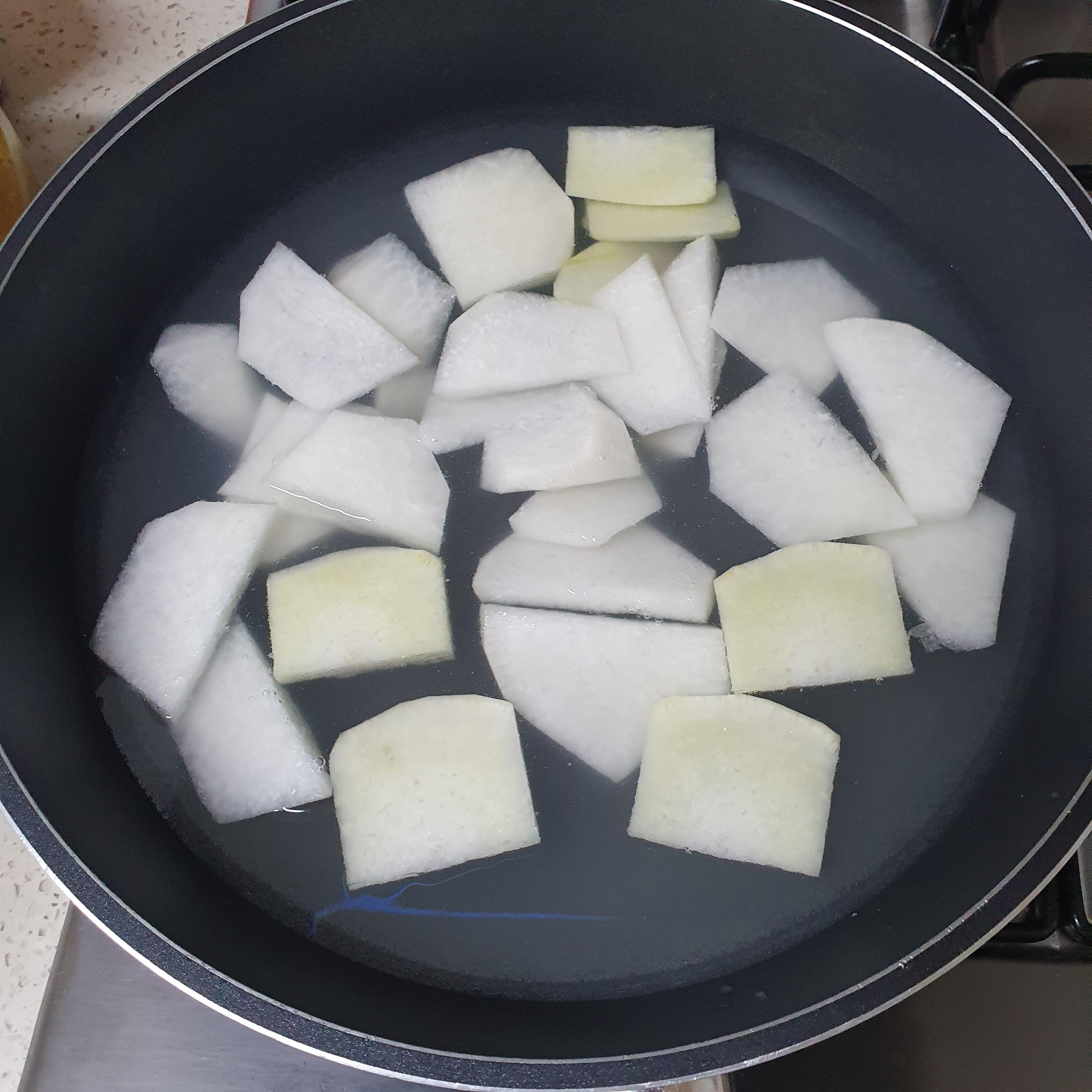 3. 미리 밥 지을 때 쌀뜬물을 따로 빼두어서 쌀뜬물과 물을 반반 섞어서 냄비에 넣고 썰어놓은 무과 함께 끓인다. (무를 넣어야 시원한 맛이 더욱 좋다.)