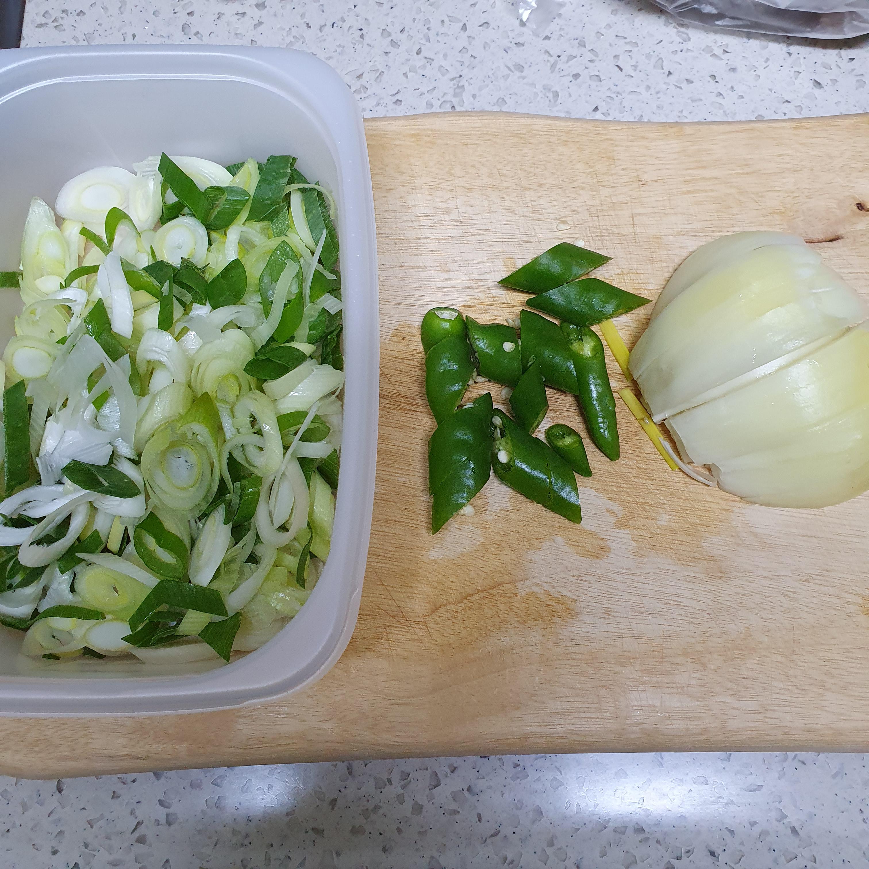 2. 대파, 양파, 청양고추, 무를 손질한다. 우리 집에는 매콤한 걸 좋아해서 청양고추는 필수!