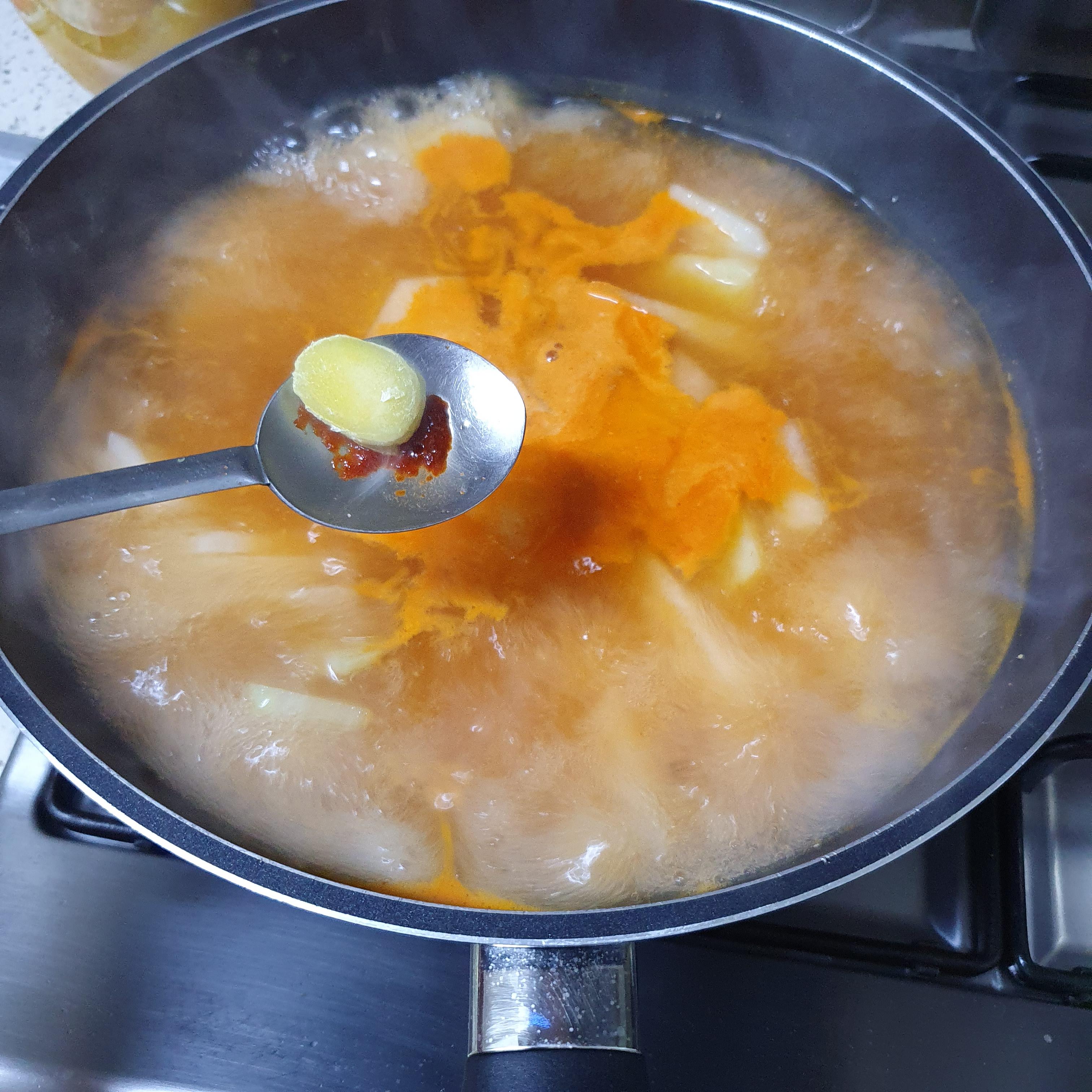 6. 집간장 1스푼 (국간장으로 대체가능), 고춧가루는 2스푼 (동태탕은 시원 칼칼해야 맛이 좋으니 일반 고춧가루와 청양고춧가루 넣기), 잡내를 잡기 위해서 생강도 편생강 얼려놓은 거 2개, 소주나 정종 좀 넣고, 양파 넣는다.