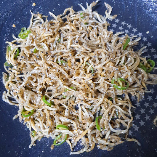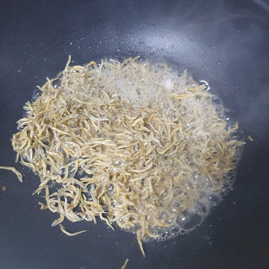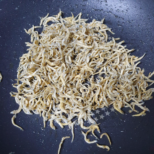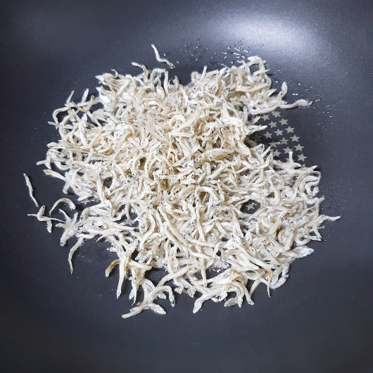 1. 잔멸치 100g 정도를 넣고 식용유를 2스푼 넣거나 한두 바퀴 빙~ 돌려주면 된다.