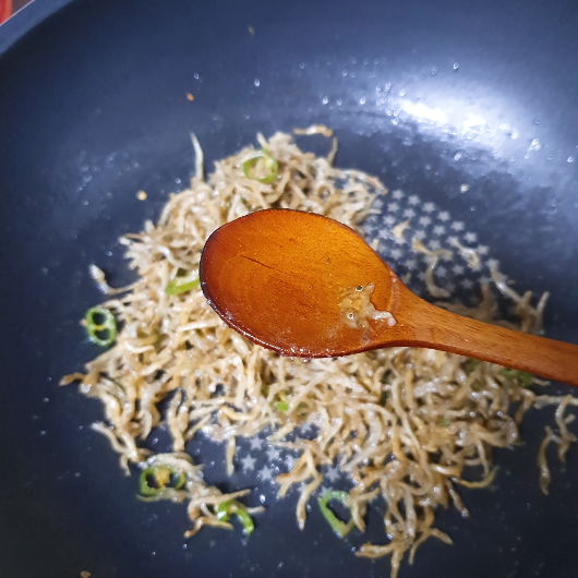 2. 조금 뽀얗게 생겼던 멸치가 튀기듯이 색이 변하고 스푼으로 볶아줄 때 바삭바삭한 느낌이 날 때까지 달궈진 중불에 충분히 볶아준다.