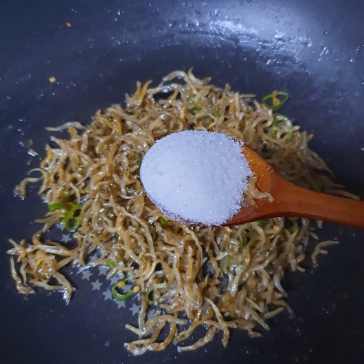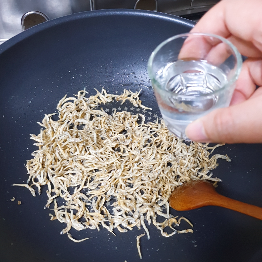 3. 노르스름하고 바삭하게 튀겨지듯 볶아진 멸치에 비린내를 좀 제거하기 위해서 소주 반잔이나 맛술을 넣어준다.