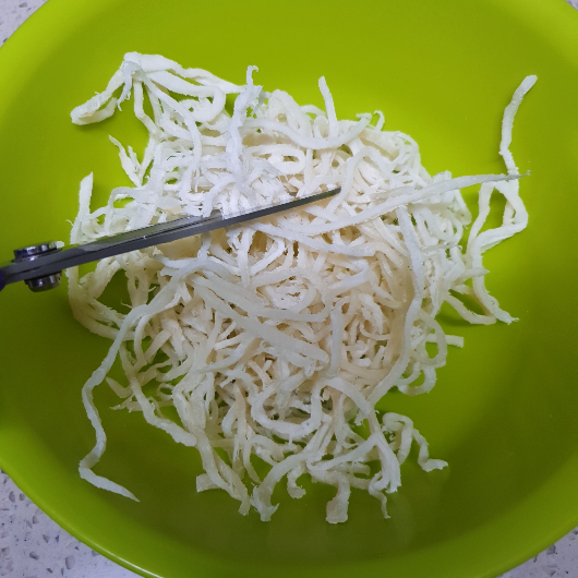 1. 진미채를 볼에 넣고 가위로 한입 크기로 잘라주고, 부드럽게 만들기 위해서 간편하게 전기포트로 끓인 물을 부어 1분간 불린다.