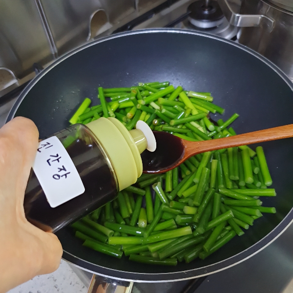 7. 마늘쫑을 볶으면서 진간장 6T를 넣어준다. (처음에 4T를 넣었는데 엄마가 싱거울 거 같다고 더 넣었다.)