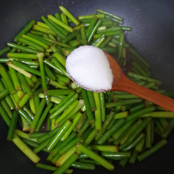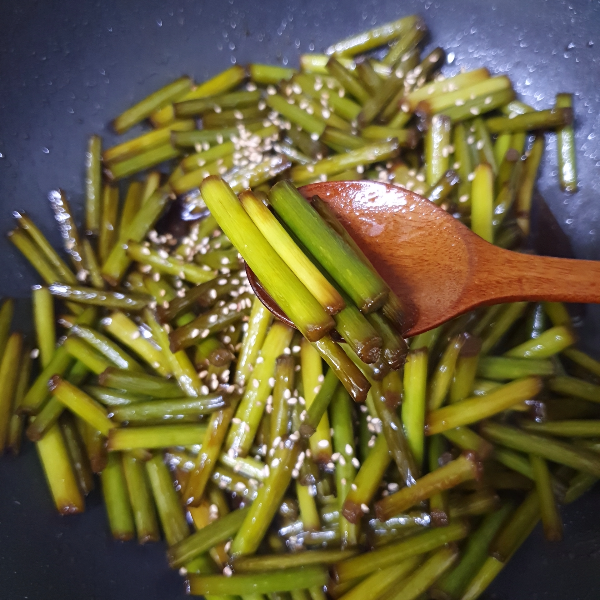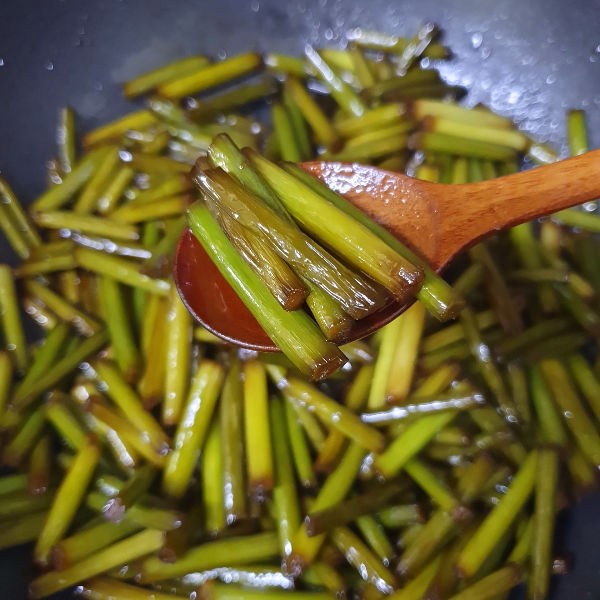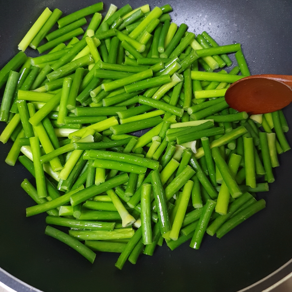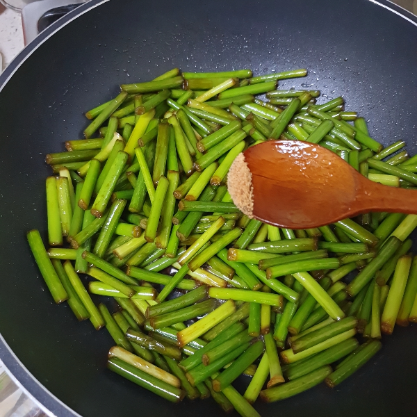 10. 약불에서 마늘쫑이 충분히 간이 베이도록 볶아준다. 색이 점점 변해가고 조금 단단했던 마늘쫑이 약간 쪼글 해진다.