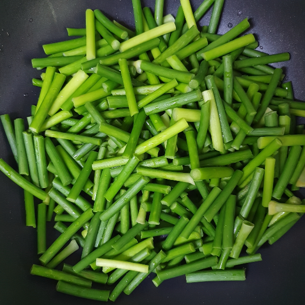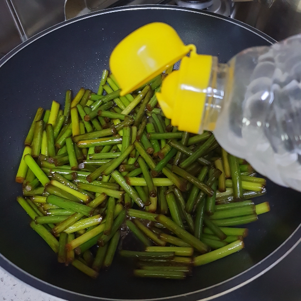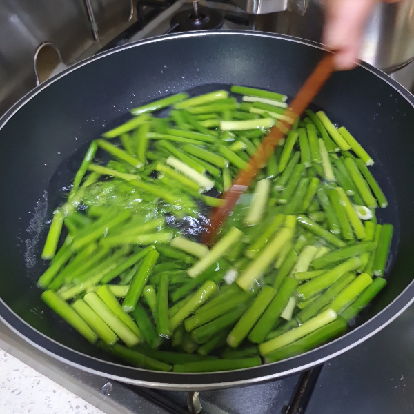 6. 팬을 달궈준 후 식용유를 1 ~ 2T 정도 넣어준 뒤, 준비해 둔 마늘쫑을 중간불에서 볶아준다.
