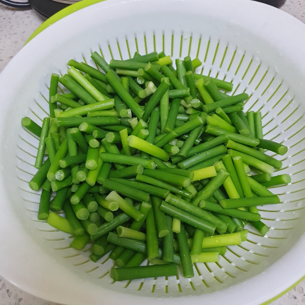 5. 살짝 데쳐준 마늘쫑을 바로 흐르는 찬물에 씻어서 준비해 놓는다.
