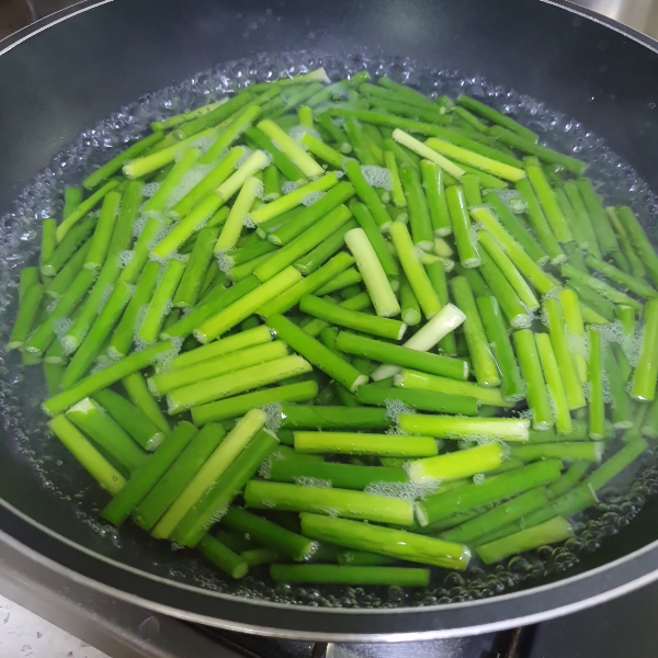 4. 팔팔 끓는 물에 깨끗하게 씻어놓은 마늘쫑을 넣고 뒤적뒤적 하면서 한번 물이 다시 끓어오르면 불을 끈다.