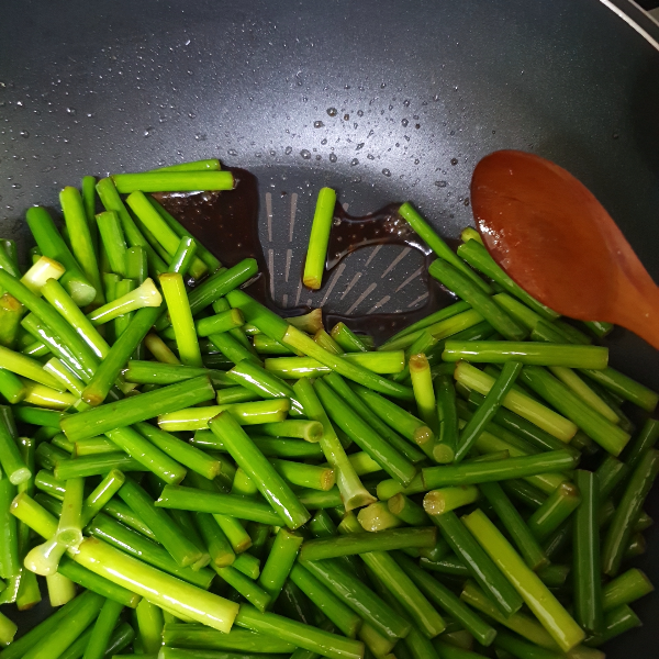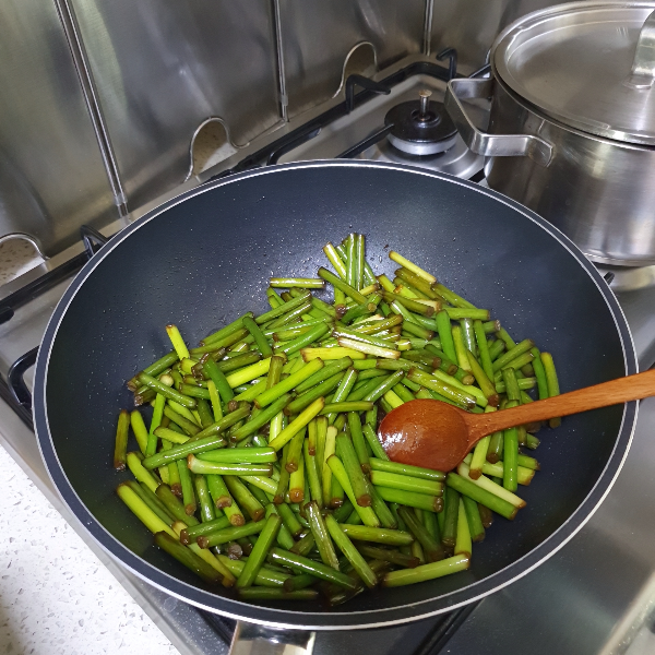 10. 약불에서 마늘쫑이 충분히 간이 베이도록 볶아준다. 색이 점점 변해가고 조금 단단했던 마늘쫑이 약간 쪼글 해진다.