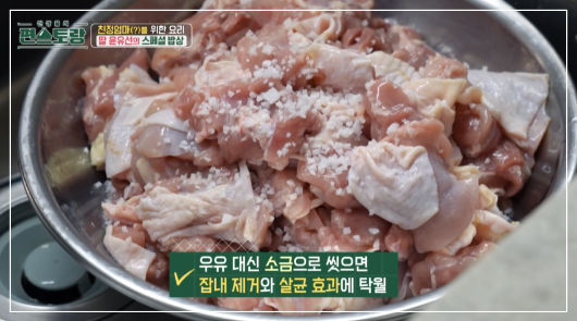 (소금으로 세척 시 간이 잘 배고, 잡내 및 살균 효과와 함께 닭고기가 쫄깃해집니다. 우유에 재워두고 사용하셔도 무방합니다.)